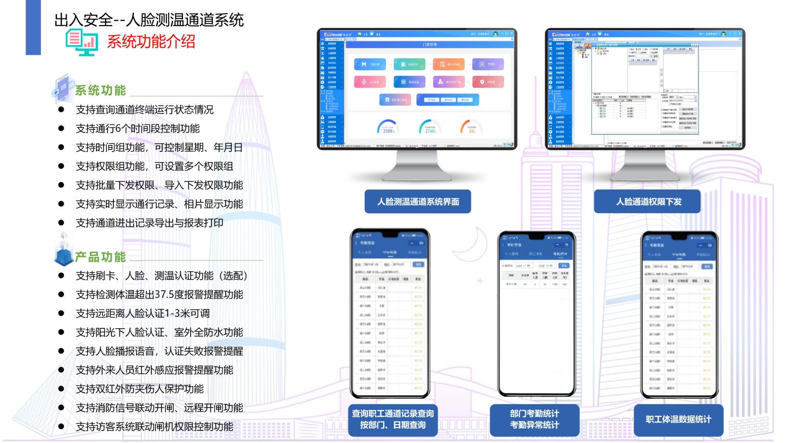 依時利企業/校園人臉測溫通道系統是通過統一管理平臺/數據庫/終端/手機端來實現綜合管理,實現職工進出大門時有效的人臉認證與測溫檢測,人臉通道閘機和門禁系統進行有效的聯動,為企業/校園安防帶來管理上的提升。有效控制通行秩序,使得出入口通行井然有序,方便人員出入管理。利用智能閘機和人臉設備對出入進行控制和管理,提高安全性與美觀度,防止外來人員隨意進出。
